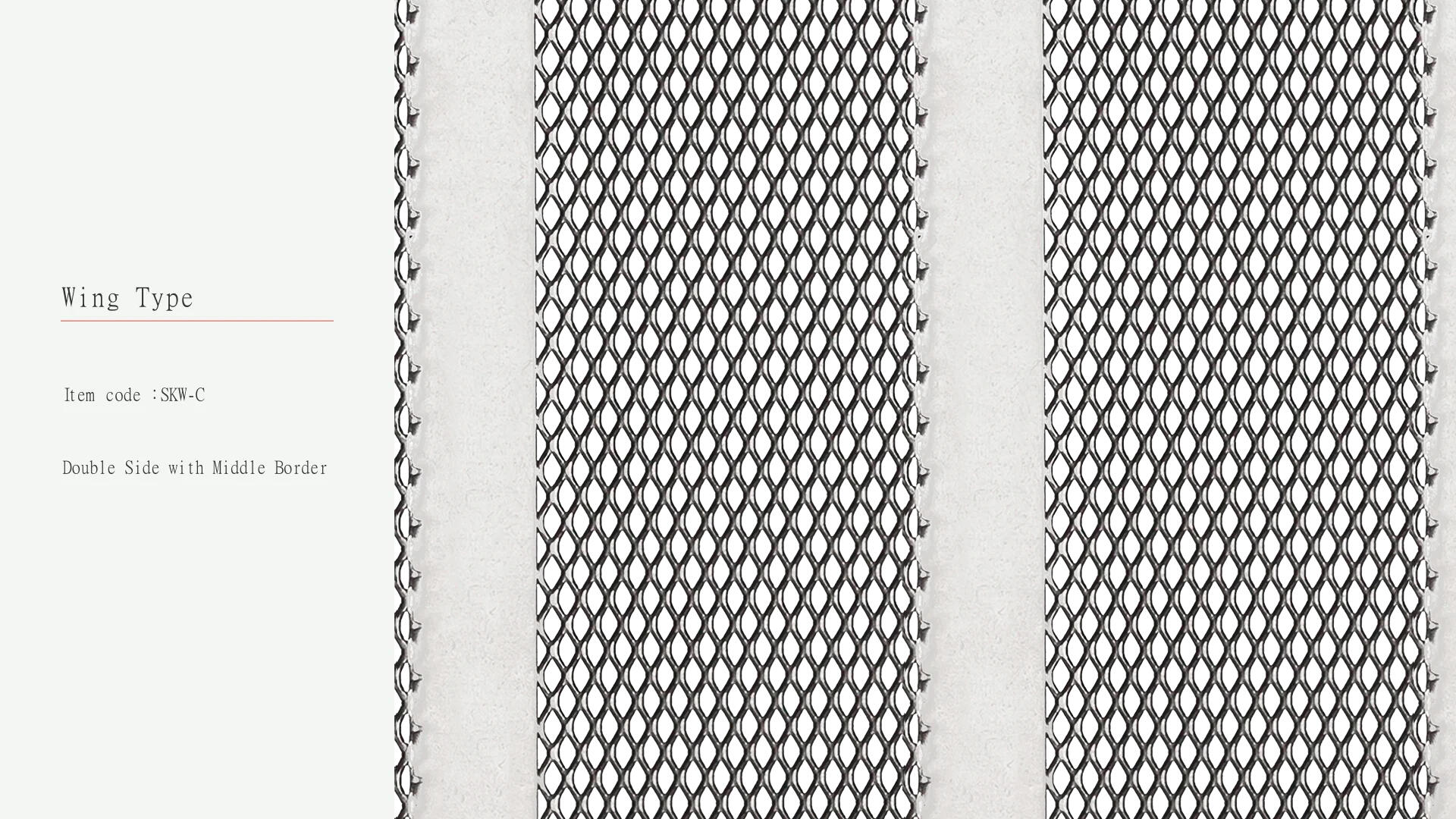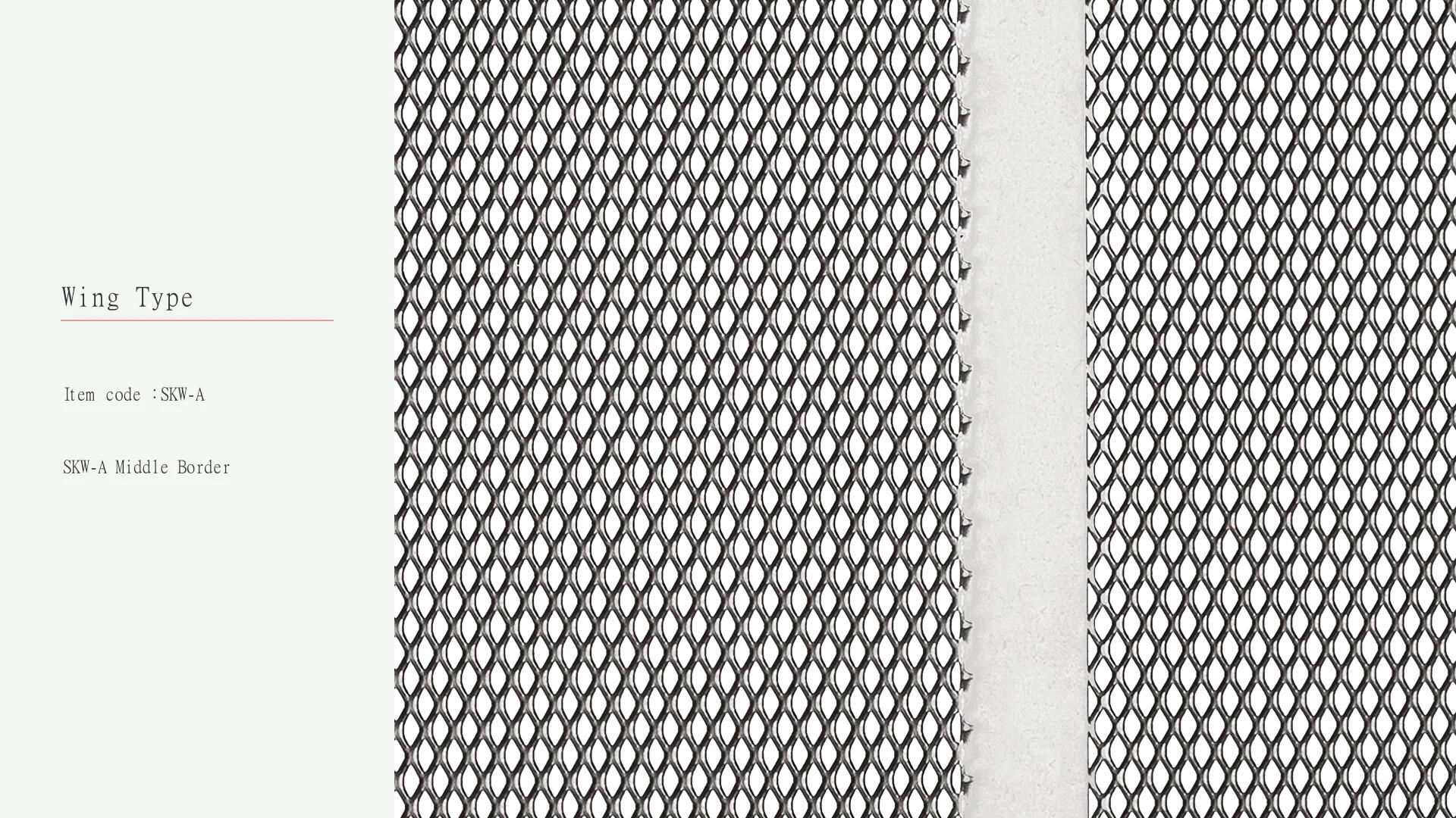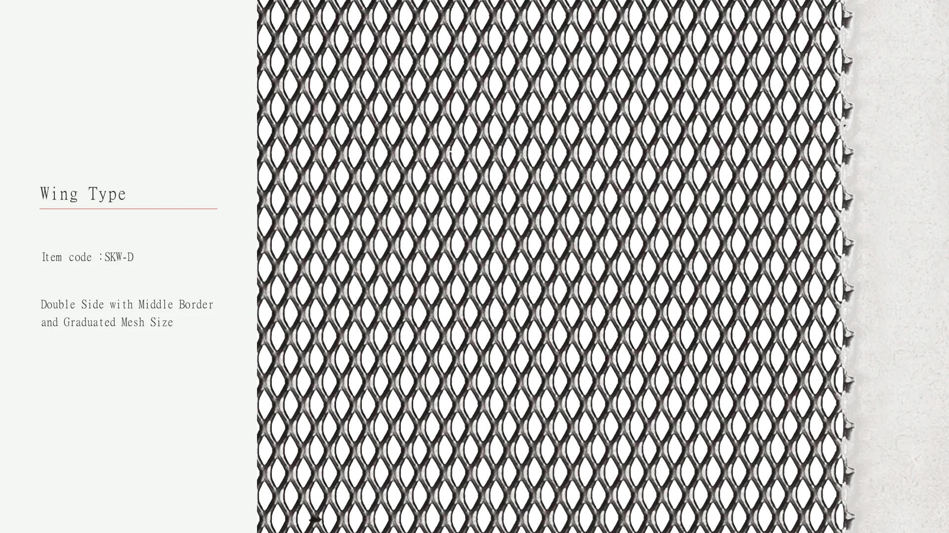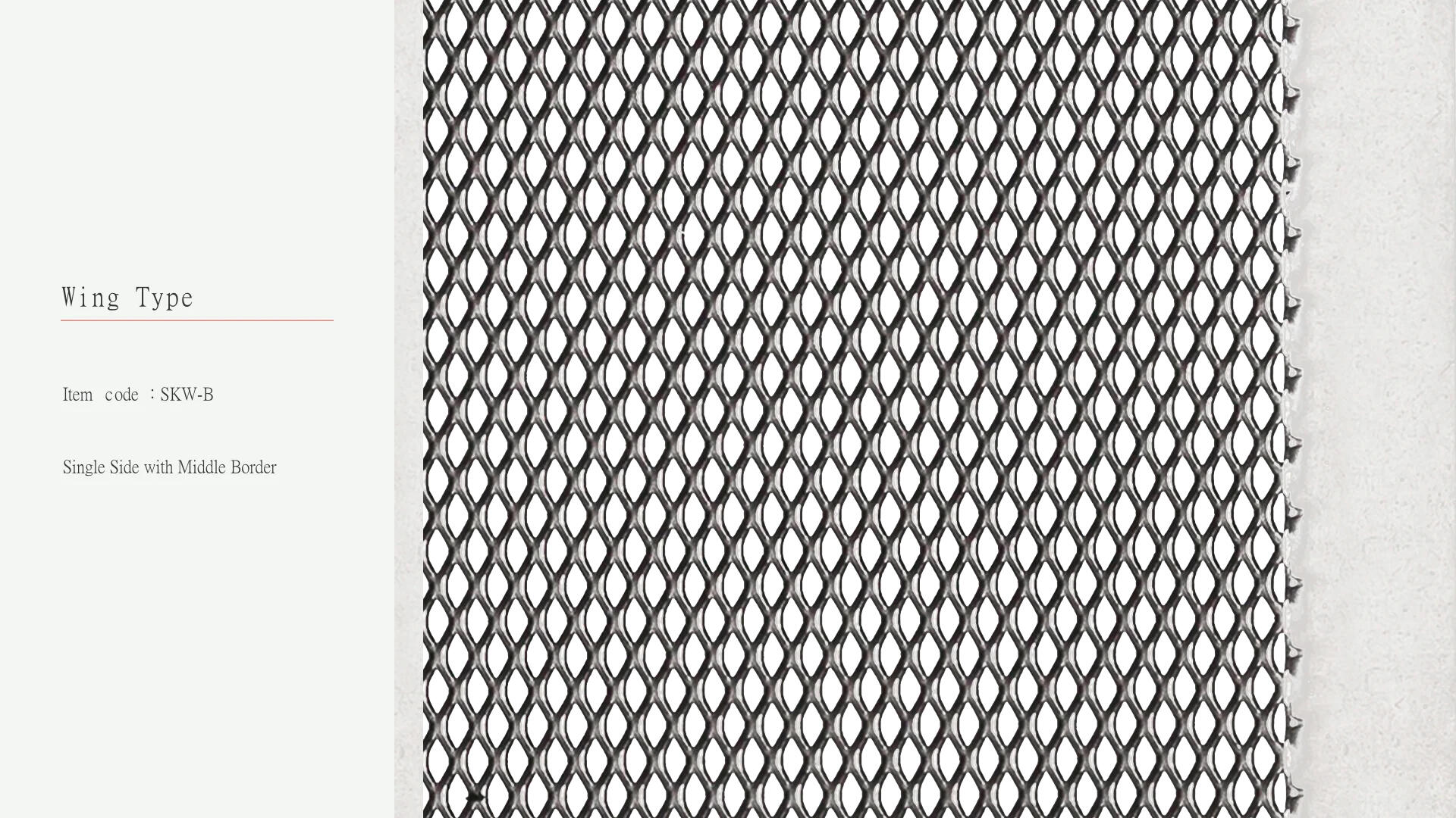El tipo Wing se compone de láminas metálicas y patrones de malla, cuyo tamaño se puede ajustar según las necesidades del cliente. Se puede elegir entre diseños con bordes a ambos lados o con espaciado alternado. Hoy en día, este tipo de malla se utiliza ampliamente en productos de diseño industrial. Por ejemplo, en aplicaciones de muebles, el borde se puede doblar en una forma específica para aumentar el grosor de la superficie de unión, o se puede aplicar a la interfaz ion-activa dentro de las baterías de litio para generar energía eléctrica, prolongando así su vida útil.